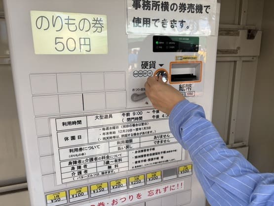 園内の乗り物は、自販機で販売されている 「のりもの券」 を購入して利用します。